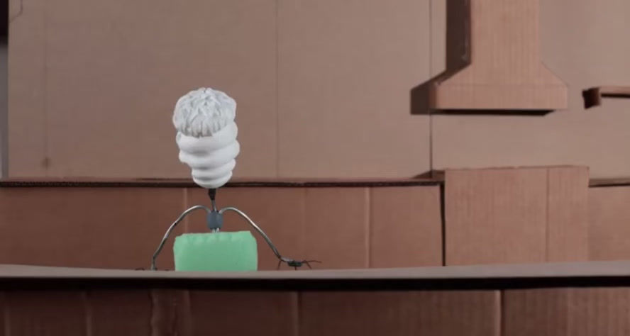 A test video was made using only the puppet's armature. Finally, a reference video was created for frame-by-frame animation using DragonFrame. A small animation of the puppet was made, a temporary set was set up, lighting was designed, and it was time to photograph!